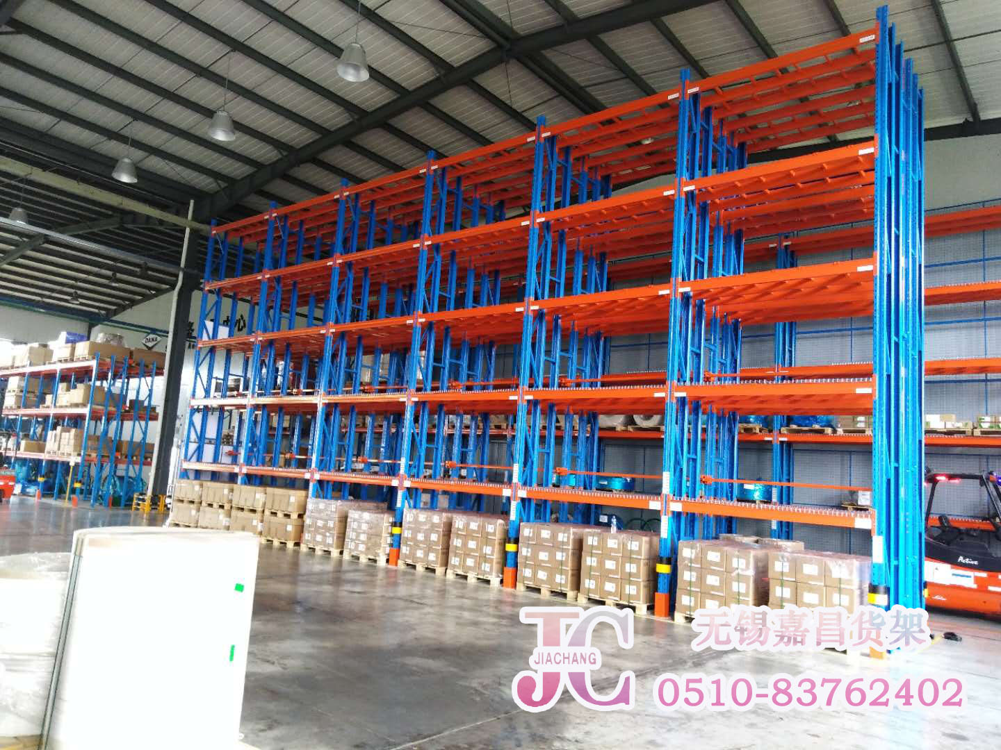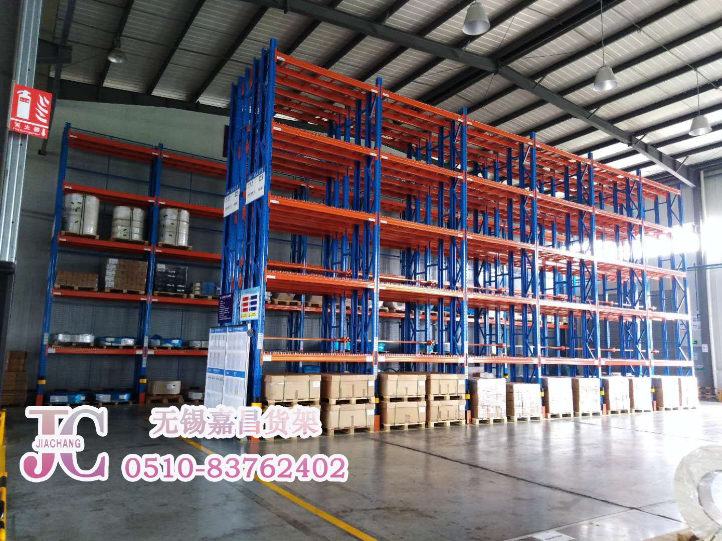 鹽城美資汽配企業高位重型貨架,每層承載4500kg/層,貨架7500高,貨架采用3立柱結構,鋪網層板,保護托盤,配合堆高機存取。最大化程度的把庫房高度的優勢利用起來。