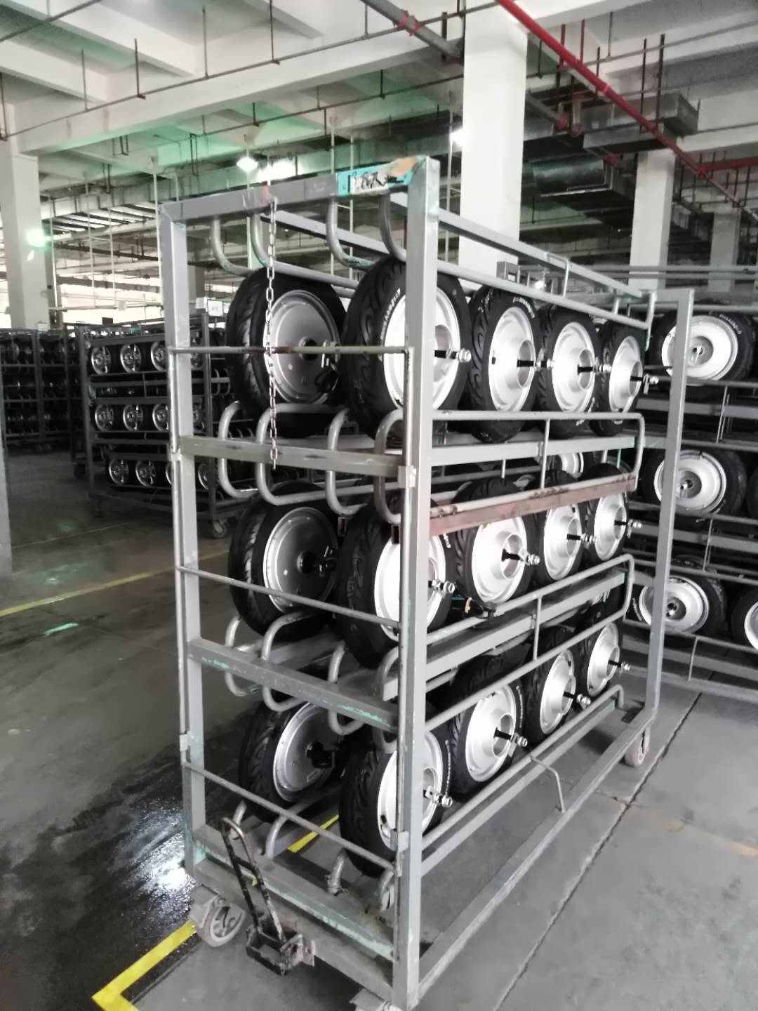 專為雅迪科技集團設計的電動車車輪周轉架,周轉架傾斜設計,前面有活動擋條,擋條上提,車輪自動滑出。前后安裝一套牽引機構,可以組合成小火車,配合腳輪設計,有效提升車間的周轉效率。